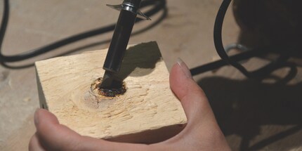 I’ve never used a woodburning pen and the instructions are moderately helpful. So I resort to good old learning by doing. I plug the tool in and give it a go on a piece of scrap wood. My dots are nowhere near round, but I already enjoy working with this tool. I revel in the smoke and the smell of burnt wood – until I return to my actual task and realise I’m not getting anywhere. I need a new plan; freehand drawing isn’t working for me. So I decide to drill holes, as this will help me to draw clean circles. A regular wood drilling or forstner bit will do.