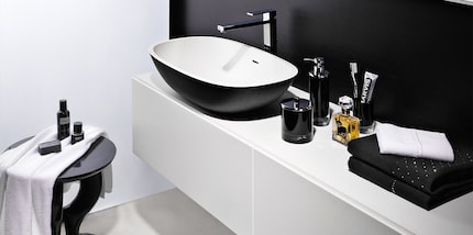 Glitter lovers will love Möve's Crystal collection: the rhinestone-encrusted items offer little focal points in the bathroom without being pompous about it. To keep the look from looking cheap, white and black are ideal for the rest of the furnishings. [[product:5337752,5337677,5337640]] [[product:5337852,5337883,5337858]]