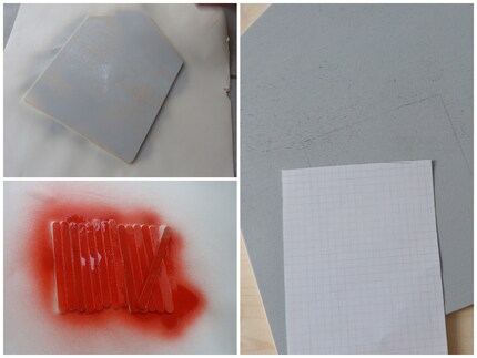 Use the jigsaw to cut out the desired shape (house, rectangle or round arch) and size from the chipboard. Then spray the wooden handles and chipboard with the appropriate colours. Once the paint is dry, transfer the outline of the door to the chipboard using a pencil template.