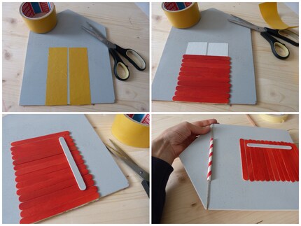 Place double-sided adhesive strips on the marked area and glue the wooden sticks all the way to the end. You can attach another wooden stick vertically as a door handle. Decorate the upper part of the "house" as you wish.