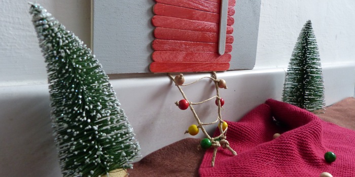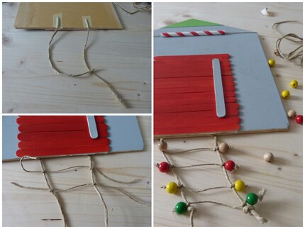 For the ladder, attach two pieces of string of the same length to the back with adhesive tape. Now cut four pieces of string of the same length for the steps. Tie these to the other two long pieces of string at regular intervals and attach a wooden bead to the end of each step. Then use power strips to attach the Secret Santa door to the wall of your choice.