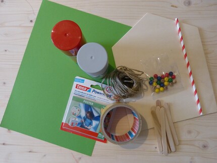 For this craft you will need chipboard, wooden handles, cord, a colourful straw, spray paint, wood beads, double-sided adhesive tape, power strips and things to decorate. A jigsaw, pencil, scissors and adhesive tape to help you with your crafting.