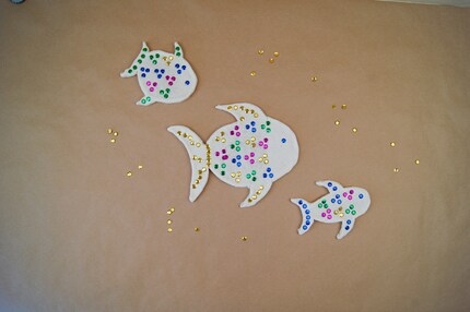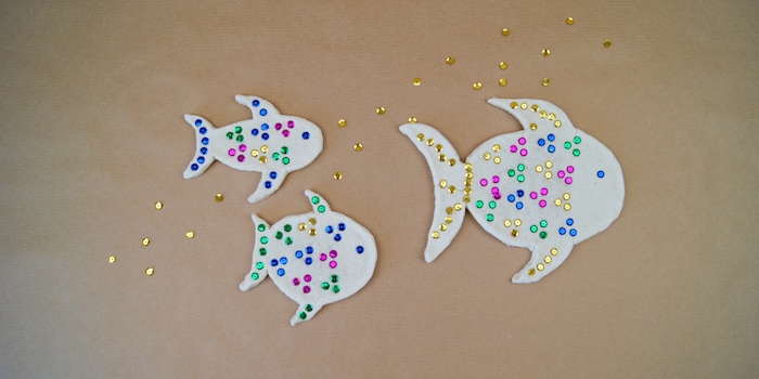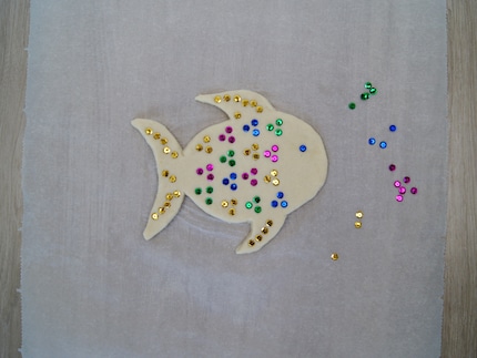 4. Now press the colourful sequins lightly into the salt dough. Leave the fish to dry for a few days. I recommend turning the fish over once after 24 hours so that it can dry better on the back. That's it, the rainbow fish is ready to captivate everyone's attention.