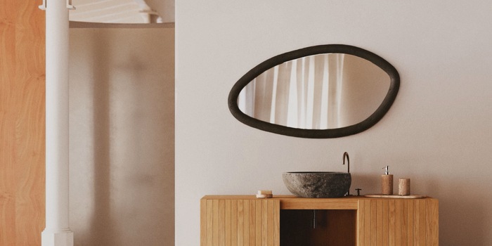 "Magrit" combines function with style. As an asymmetrical mirror, it nestles against the wall. It is ideal for breaking up rigid right angles or adding visual interest. This is because it has a frame made of solid wood. Thanks to its organic shape, you can hang it either vertically, horizontally or even at an angle.