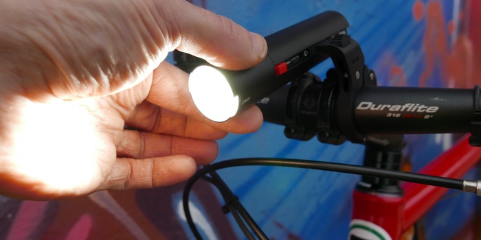 I'm a fan of knog. products and the "PWR Road" doesn't disappoint on first impressions. The matt black aluminium housing feels good and the lamp head clicks into place securely when I attach it to the battery. The whole thing results in a stylish torch that feels like it has been made from a single mould. Well, almost. The housing is interrupted by a rail on which the torch is pushed onto its holder. There is also a red button to release the lamp head from the battery. The light can be switched on and off with a quick twist of the head.