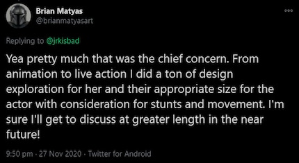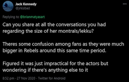 With some fans content to rant online about how the makers of "The Mandalorian" series messed up Ahsoka Tano's design, Twitter user Jack Kennedy reached out to character concept designer Brian Matyas via the platform. The question: "Can you talk about the design process behind the Montrals and Lekku?" In addition to the suggestion that the large Montrals and long Lekku were impractical for an actress.