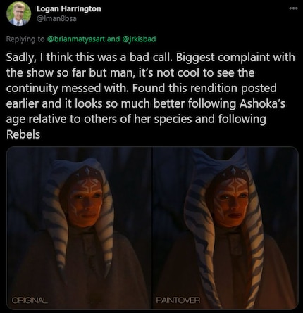 Twitter user Logan Harrington disagrees with the man who invented the whole thing and shows a design suggestion that's better. Because the image he found on the internet shows Ahsoka better in relation to her age.