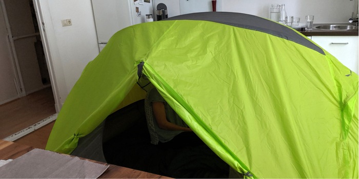 The description of the poison green dome tent Salewa Denali says a few things that were to be expected ("comes with plenty of interior space") and nothing that argues against using it in old flats. It is suitable for trekking and hiking in the mountains. We are in Schöneberg and hike from the balcony into the kitchen with the tent half pitched.
