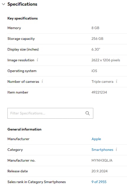The Galaxus website currently lists 90 million product specifications, ranging from colour to material type to country of origin to screen size. This works out at about eleven specs per product. Twelve months ago, it was 7.5 per product.