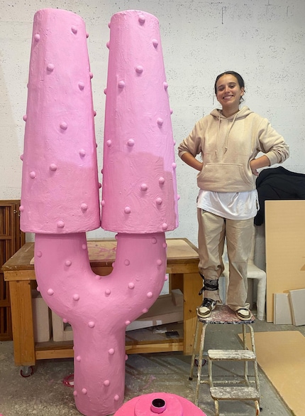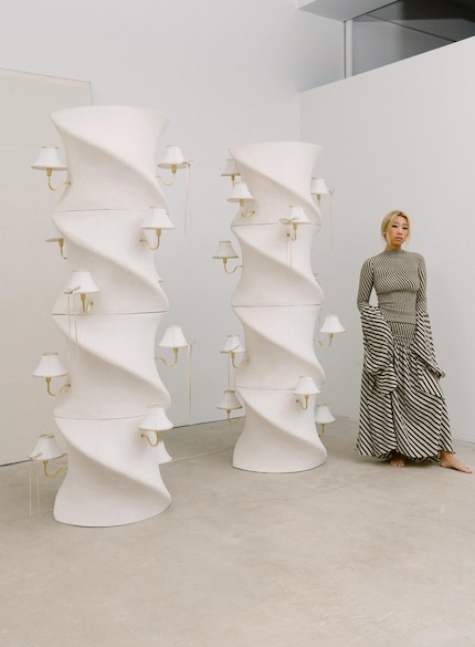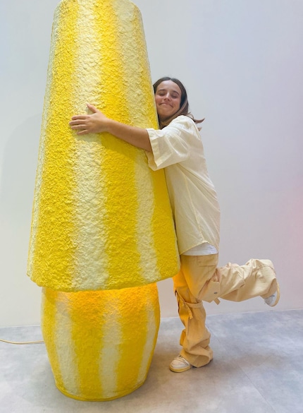 The plaster floor lamps designed by Léa Mestres, for example, are so huge they’re taller than the French artist herself. Surprisingly, they look light as a feather in their pastel shades ranging from piggy pink to baby blue and lemon yellow.