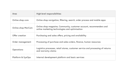 A software component is based either in a module (microservice) or in a modular monolith. There are currently over 50 modules (one to two per team). Our technology stack is mainly based on .NET Core, MS SQL Server and MongoDB. We use React with Next.js and GraphQL for our online shop front end. Both the modules and the monolith are run in a Kubernetes cluster. Messaging (Kafka and Azure Service Bus) is used for asynchronous communication. You can find our complete tech radar here.