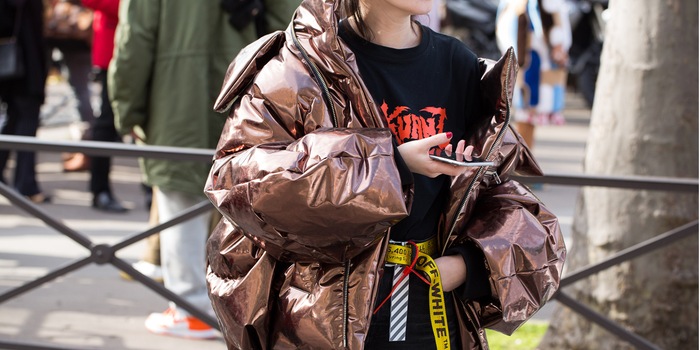 In addition to a metallic finish, a shiny finish also makes for an extravagant look that screams "here I am". Keep the rest of your outfit a little simpler or go all out. In other words, like the black-haired street style icon (name unknown to the editorial team), combine your puffer jacket with shiny vinyl trousers. To style this shiny extreme look a little more casually, I recommend Dr Martens or plain-coloured sneakers, as Alicia Roddy combines with her white trousers. By keeping the colours of the rest of her outfit understated, her eye-catching high-shine jacket becomes wearable. Caution: Shiny models in black are often reminiscent of a bin bag. Better keep your hands off it. After all, you don't want to throw your new trend piece straight in the bin, you want to score points with it.