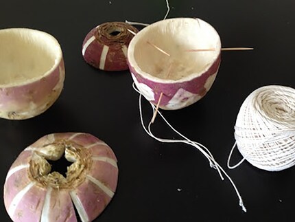 Poke three holes with a toothpick or something similarly pointed and pull the approx. 70 cm long strings through them. Then knot each hole individually. Next, make three holes in the lid of the beet. Now you can thread the strings through them. The toothpick is the best tool to help you thread the strings through. Finally, double knot the whole thing.