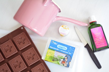 Step 1: Cut the glycerine soap into small cubes and put them in the pot. It is best to use a milk pot with a spout. This makes it easier to fill later. You can find glycerine soap in any DIY or craft shop.