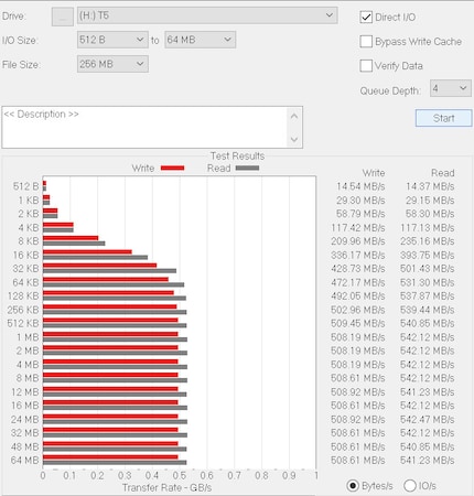Lese- und Schreibgeschwindigkeit T5 ATTO Disk Benchmark