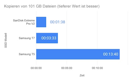 Als erstes ist ein 101 GB grosser Dateiordner mit MP4, RAW-Fotos und einem Premiere-Pro-Projekt dran. Die V2 benötigt dafür 1 Minute und 38 Sekunden. Die Geschwindigkeit von durchschnittlich 1,03 GB/s kann die SSD während der ganzen Übertragungsdauer durchziehen. Damit ist die SSD auch beim realen Test mehr als doppelt so schnell wie die T7, die 3 Minuten und 33 Sekunden brauchte.