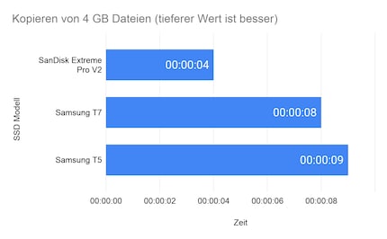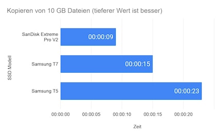 Damit der Vergleich mit der T7 aufgrund des anderen USB-Standards nicht ganz so unfair ist, habe ich den Test ein zweites Mal an einem USB 3.2 Gen 2 Port gemacht. So benötigt die V2 2 Minuten und 36 Sekunden für die Übertragung und die Geschwindigkeit beträgt durchschnittlich 655 MB/s. Damit ist die SSD von SanDisk immer noch beinahe eine Minute schneller als die von Samsung.