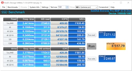 Der Benchmark von Anvil’s Storage Utilities gibt nebst Lese- und Schreibgeschwindigkeiten sowie IOPS auch Antwortzeiten wider. Hier zeigt sich: Die Antwortzeiten beim sequenziellen sowie zufälligen Lesen und Schreiben sind bei der Extreme Pro V2 kürzer. Alles in allem schneidet die V2 im Benchmark rund 60 Prozent besser ab als die T7.