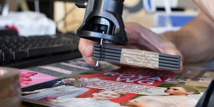 After having drilled the holes, I grab a stack of paper and cut it to Super Disk size with a boxcutter. Then I make two holes with a hole punch at the same location as those on the disks. Now all I have to do is insert two cable ties and my notepad is complete. Instead of cable ties you can also use ring binders, if you feel like spicing up the look of your notepad.
