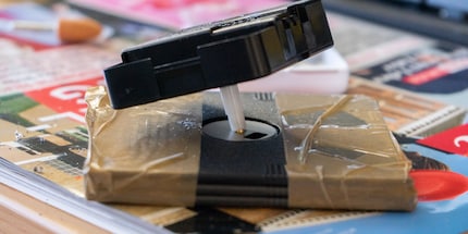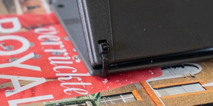 Show allFirst I glue the five disks together with tape. This makes sure that all the holes I drill are in the same place. To connect the Super Disks I need four holes per diskette, one in each corner. Since Super Disks already have holes at the bottom left and right, I only have to drill two holes at the top. Not that easy when you only have a Dremel. In addition, the drills supplied with Dremels aren't meant for plastic. That's why I keep slipping up, resulting in two asymmetrical holes. If you want to try this, I recommend a cordless drill and a metal drill. Thanks to its tip you slip less and don't crack the plastic.