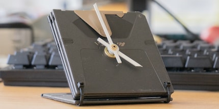 For this project you need Super or Floppy Disks and cable ties as well as some clockwork. As I didn't have much time, I got mine at the hardware store. Of course, you'll also find great models on Galaxus. While looking at the clockwork, I quickly notice that I can no longer work with the Dremel. In order to work it, I have to use a 10 mm drill, and I can't fit those into the Dremel. I need to get a real drill and drill bit.