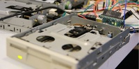 I need five floppy discs, cable ties and some device to make holes in the Super Disks. Our office isn't very well equipped in those regards. Only the Dremel 4000, which I used for milling out the back wall of the Sleeper PC, is at my disposal. Luckily I can drill with it as well.