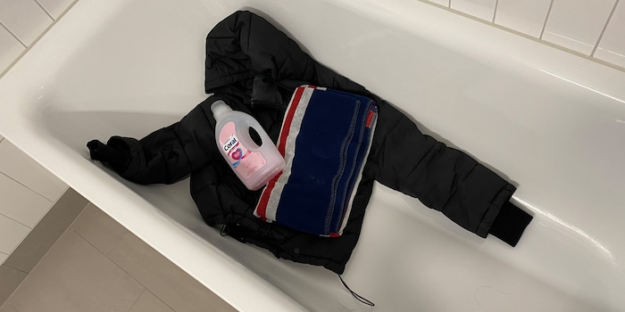 Damit du deine Daunenjacke richtig waschen kannst, brauchst du eine Badewanne oder ein Spülbecken. Willst du gleich mehrere Jacken waschen, solltest du es in der Wanne tun. Bei einem Kleidungsstück reicht auch ein Spülbecken. In der Badewanne musst du weniger gut aufpassen, dass etwas daneben gehen oder überlaufen könnte. Im Lavabo hingegen sparst du Wasser und Seife. Ein Flüssigwaschmittel speziell für Daunen lege ich dir für die korrekte Reinigung ebenfalls nahe. Es existieren auch Produkte speziell für Outdoor-Daunenjacken. Notfalls kannst du gar auf Daunenkissenwaschmittel ausweichen. Ausserdem solltest du ein möglichst grosses Strandtuch zur Hand haben. Schliesslich benötigst du einen Wäscheständer, um die gewaschene Jacke aufhängen und trocknen zu können. Es kann auch eine Stuhllehne dafür herhalten, wenn du keinen Wäscheständer hast.