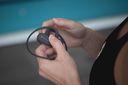 There’s one thing Svenja doesn’t like: the cable that connects the two buds is too long. Sony supplies an adjustment band that lets you shorten the cable on the back of your head, but it’s a bit tricky to put on. Especially when the headphones are wet and your fingers puffy from the water.