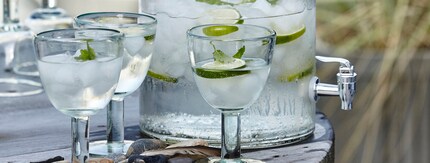 Depending on what your guests like to drink, choose for glasses that are suitable for several types of beverage. Don't forget the shaker for preparing certain cocktails. Instead of salad bowls, you can opt for trendy drinks dispensers - everyone can serve themselves as they please. Plastic cups are also very practical and lightweight.