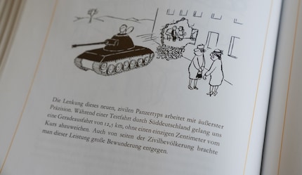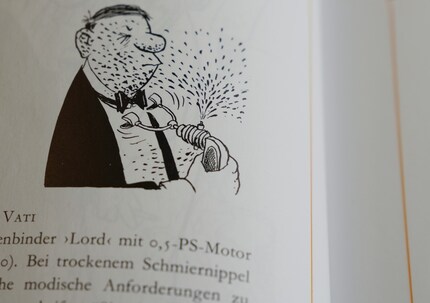 No one poked fun at the stuffy bourgeoisie of the post-war period like Loriot. This included parodying questionable products and their marketing. For example, Loriot recommended the "Lord automatic dinner jacket bow-tie with 0.5 hp motor and downdraft carburettor" as a gift idea and wrote: "However, the high consumption of lubricant makes the purchase of the device unprofitable." As usual with him, the comedy only comes from the combination of text and image.