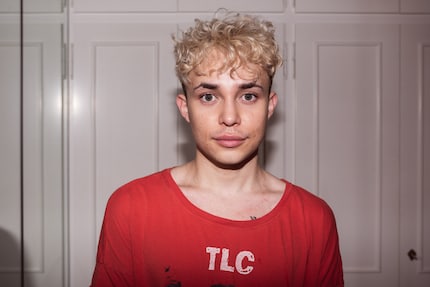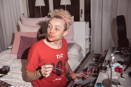«I find putting on make-up quite relaxing. It’s kind of like therapy. That’s why I like to spend a lot of time on it,» he explains, with obvious enthusiasm. His eye make-up is what takes the longest. He uses different shades of lilac to add more intensity to his look with each brushstroke, while white kohl makes his blue-green eyes appear bigger. And he doesn’t stop at just one set of false lashes; a second set is swiftly added. You can’t deny that every movement is precise. Meanwhile, the room itself is getting more and more chaotic. Brightly coloured eyeshadow palettes and used brushes are piling up on his bed. Unperturbed, Vitor seems all the more focussed.