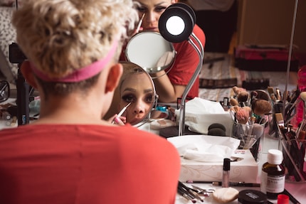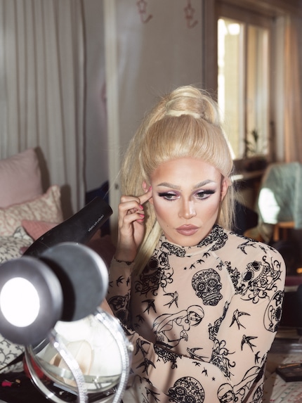 «When you give it your all on stage and have the spotlights on you, your work has to hold up,» he tells me, while working sweat-resistant theatre make-up into his skin. He uses a dark cream colour and light powder to contour and give his face more dimension with each layer. It makes his soft features even more feminine. «This is what sets it apart from standard make-up. When you’re doing drag, everything can be more exaggerated. For instance, your skin doesn’t have to look like skin when you see it close up. What’s important is that the look makes an impact from afar.»