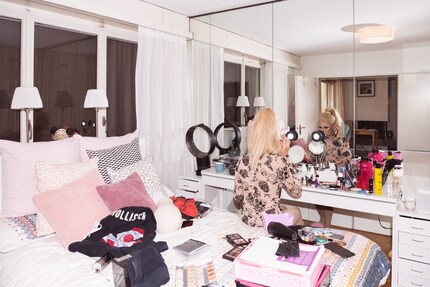 Five hours have now gone by while we’ve been chatting and Victoria has emerged. She reaches into her shoe bag for the right heels. «Too basic» is her verdict after looking in the mirror at herself in a pair of nude Calvin Kleins. Instead she opts for patent black over-the-knee boots. These are shoes I couldn’t even take one step in. Victoria, meanwhile, is happily dancing about in them across the parquet floor. It then suddenly occurs to her that she’s forgotten something and she scurries off. «You’re not dressed without perfume. It completes my transformation,» she calls through to us from the bathroom.