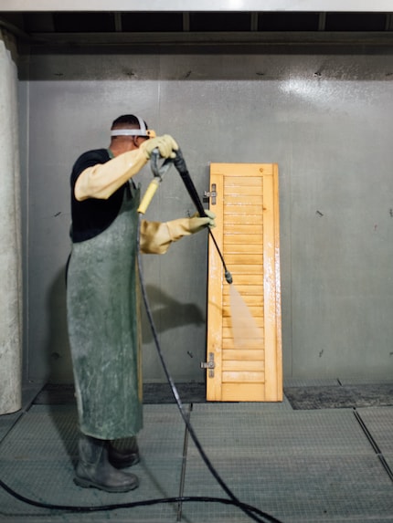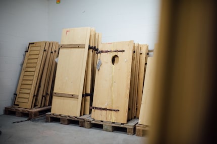 When window shutters arrive in the studio, the first step is to strip any paint or varnish off the wood. The window shutter is placed in a caustic soda bath at 50 to 60 degrees Celsius and remains there for about 30 minutes. After this, a prisoner in rubber boots, gloves, an apron and face protection washes the shutter down with water. «Lye is corrosive and must not come into contact with skin,» Tschumi explains. The shutter then ends up in an acid bath before being washed clean again. After this, it needs to dry thoroughly.