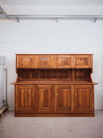 Once they've been spray-painted twice, the bench legs re transported to the drying room via the rails. There are many shutters in a wide variety of colours there, too. «This reminds me of an installation I saw at Milano design fair,» says photographer Thomas, who's accompanying me. It's a contrast to the rest of the painting studio, which seems rather sterile with its white walls, white work clothes and white lighting. Every Monday or Tuesday the drying room is emptied and all the goods are brought to the dispatch room. We enter the dispatch room and I see an old buffet. «That's an heirloom. A private client asked us to refurbish it,» Tschumi states. The painting studio of JVA Lenzburg prison also accepts these kinds of jobs, although they’re rather demanding: «I wouldn’t ask most prisoners to do such a big job. There’s too great a danger of something going wrong.»