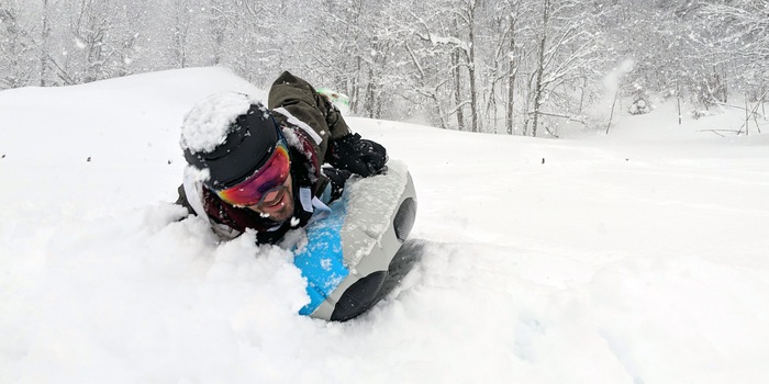 On my skiing holiday, I look for small slopes that are suitable to test the airboard. As long as they’re steep enough, this is a welcome and fun change in between skiing runs. This wide-based board takes up quite some speed, you can hear the the base structure that helps you steer whizz over the snowy surface, you race down the hill with your head only a few centimetres above the ground and you take off and land softly once you hit the slightest of bumps – yes, even short slopes are exciting. The thrill of airboarding has definitely captured me. As soon as you pick up a certain speed, you forget where the board begins and your body ends. After trying it out in deep powder snow, I totally get that Joe Steiner was inspired by bodyboarding in water when he came up with the airboard.