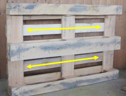 For the "large herb garden" project, you need a whole pallet from which you remove the two narrow intermediate boards (see the yellow arrows in the next picture). You will need the intermediate boards for the bases of your herb beds.