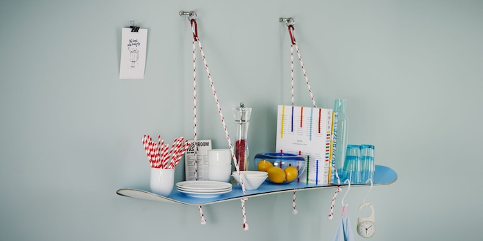 It's all about style: a snowboard attached to a rope and carabiners becomes a practical shelf, bringing a sporty touch to the kitchen, bathroom or bedroom.