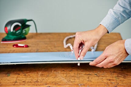 Choose the ideal height for your shelf and secure the rope to the snowboard with a knot.
