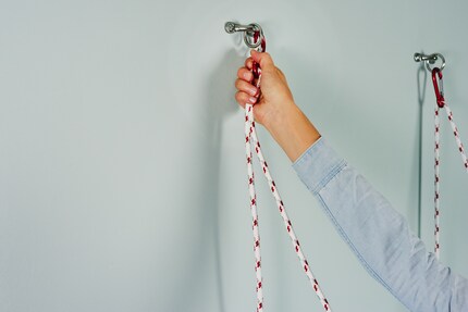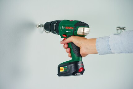 Then screw the metal gussets to the wall. The Bosch IXO V cordless screwdriver, for example, lends itself perfectly to this use. Clip the carabiners onto the loops.
