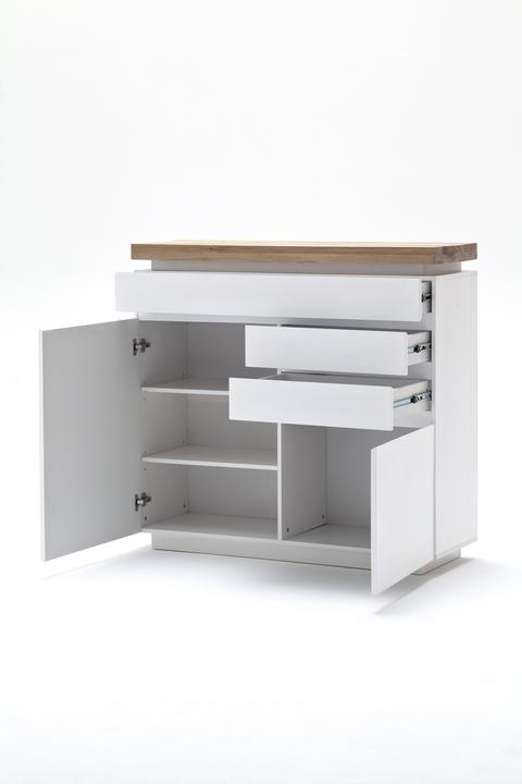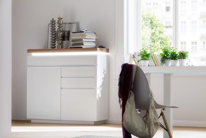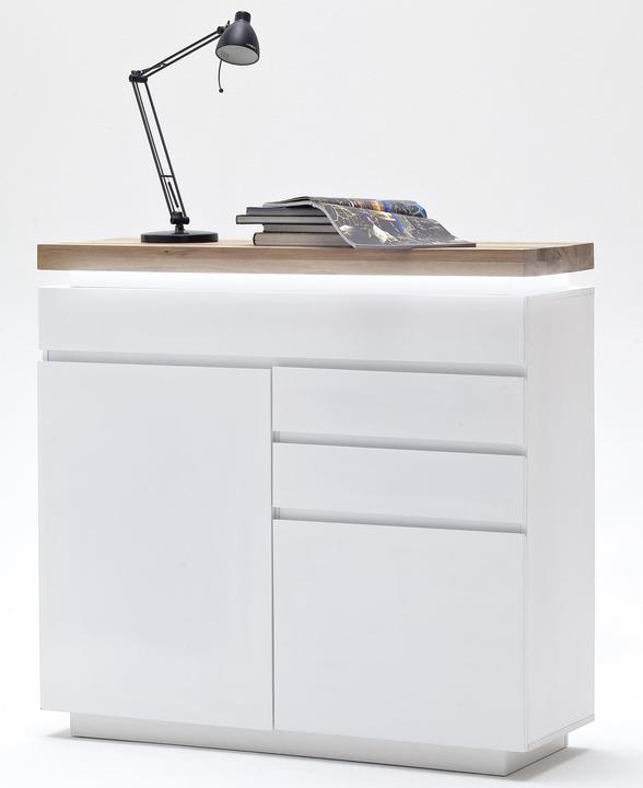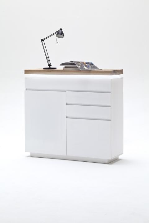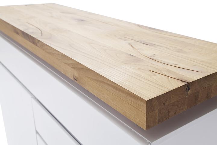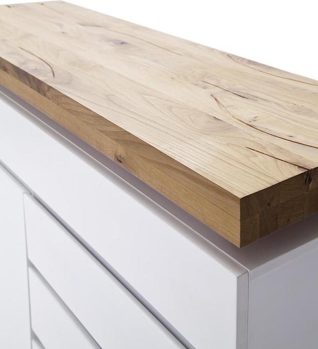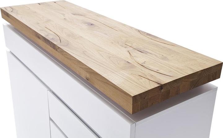 Chest of drawers with 2 doors and 3 drawers, carcass and front in white matt lacquered MDF. The top panel is made of solid oiled oak, approximately 6 cm thick, featuring LED RGB color-changing lighting with a remote control. The top shelf can support a maximum of 30 kg. Dimensions are 120 cm wide, 114 cm high, and 40 cm deep. Each door includes 1 shelf, and the top center drawer measures 119 cm wide, 14 cm high, and 35 cm deep. Each drawer measures 54 cm wide, 14 cm high, and 35 cm deep. Delivery is disassembled and includes assembly instructions.