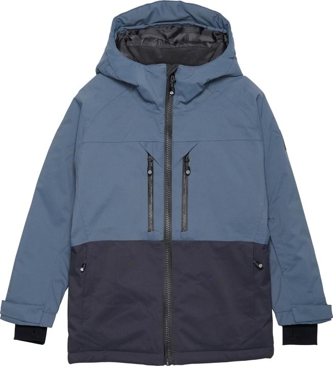 Breathable, waterproof, windproof, warm ski jacket for Color Kids boys made from durable material. The fabric is breathable, windproof, and waterproof, allowing your child to stay outside in rain, snow, and wind without getting cold and wet. It features a tested water column pressure of 15,000 mm and breathability of 8,000 g. The jacket closes with a high-quality zipper at the front. It has good internal wind protection. A chin guard ensures that the zipper feels soft against the chin. The jacket includes a fixed hood and zippered outer pockets. Reflective details are located on the back of the jacket and on the sleeve. Additional practical features include inner cuffs with thumb holes and adjustable outer cuffs that can be securely closed. There is a pocket for lift passes on the left sleeve and an inner snow skirt with snap buttons at the bottom. It has a name label inside. The snow jacket is treated with BIONIC FINISH® ECO. Certified by GRS CERES-0366.