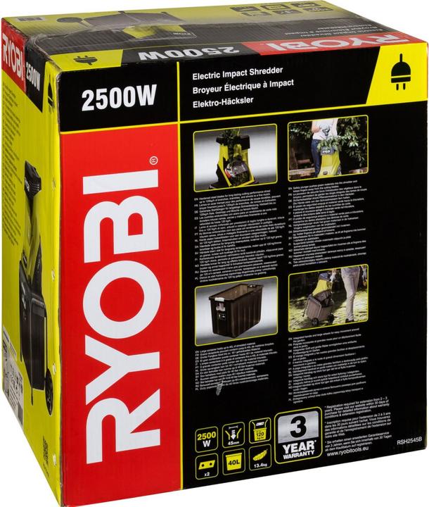The RYOBI RSH2545B Electric Shredder is a robust device equipped with a powerful 2500-watt motor, specifically designed for shredding shrubs, branches, and other soft materials. Safety during operation is ensured by a practical safety stopper, which not only allows for quick material throughput but also supports the safe feeding of cuttings. The mobility of the shredder is enhanced by extra-large rear wheels, which guarantee a stable stance while providing high maneuverability and ease of movement. The shredder features a sturdy plastic collection box with a capacity of 40 liters, making it easier to catch and dispose of the shredded material.