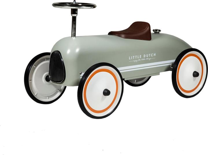 Let your little one start the engine and race into a new adventure! With this cool retro ride-on car, your toddler will have their first big appearance. This retro car is a vintage ride-on that supports your child in their first steps. This olive green retro ride-on car, inspired by Formula One from the 1950s, looks fantastic in any room, whether as decoration in the nursery or the living room. The metal ride-on car features metal wheels, rubber tires, and a plastic seat. The seat height is 28 centimeters, measured from the floor to the top edge of the seat.