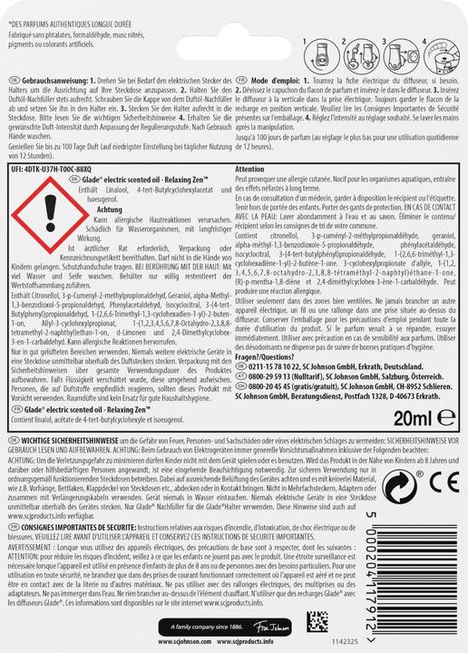 The Glade electric scented oil refill with essential oils now offers a wonderful fragrance experience for up to 120 days (on low setting with 12 hours of daily use). The long-lasting authentic scent for your home, crafted by master perfumers, fills the room with notes of jasmine blossoms, creamy sandalwood, and musk. The Glade electric scented oil diffuser features adjustable fragrance intensities to suit any room size. Glade electric scented oil fragrances are made without phthalates, parabens, formaldehyde, nitro-musk, and dyes. Instructions for use: 1. If necessary, rotate the electric plug of the holder to align with your outlet. 2. Unscrew the cap from the scented oil refill and insert it into the holder. 3. Plug the holder upright into the outlet. Always keep the scented oil refill upright. Please read the important safety instructions. 4. Achieve your desired fragrance intensity by adjusting the control level. Wash hands after use. Enjoy up to 120 days of fragrance (on the lowest setting with daily use of 12 hours). Glade exclusively uses premium recyclable bottles made from unbreakable plastic. Additionally, Glade electric scented oil consumes five times less electricity than a standard LED lamp (9W or more).