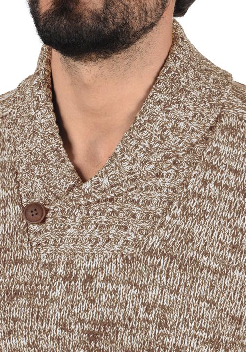 Shawl collar with decorative wooden button, ribbed hem and sleeve cuffs, leather logo patch on the hem, coarsely knitted, melange look.