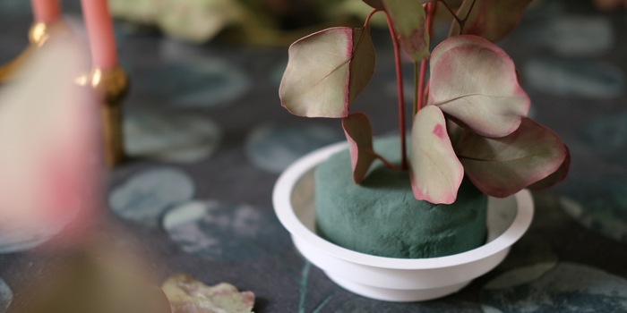 Lauren, wedding planner chez Stone House Creative, a embelli une table pour un mariage avec plusieurs arrangements de violettes. J'ai voulu essayer la même chose avec de l'eucalyptus, qui est de saison et qui reste beau longtemps une fois séché. Là encore, j'utilise de la mousse à piquer et j'enfonce les tiges une par une, du centre vers l'extérieur. C'est tellement rapide que je pourrais en faire d'autres. Mais je m'en tiens à une seule pour l'instant.