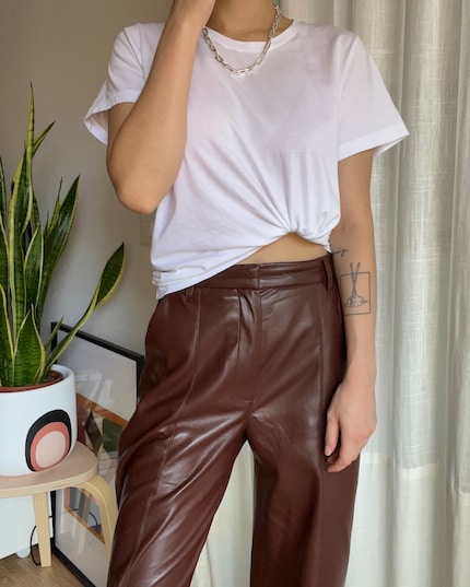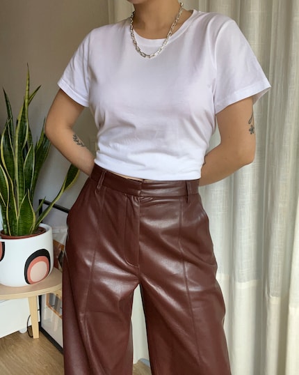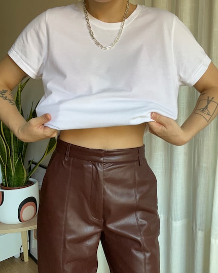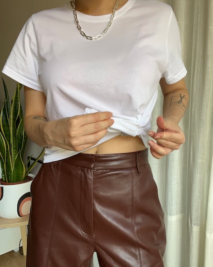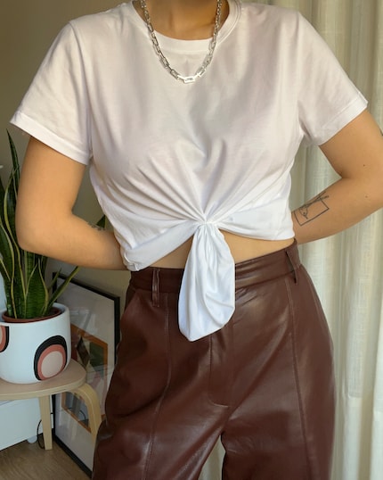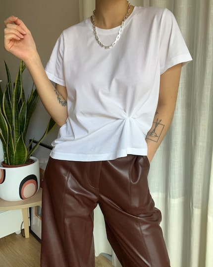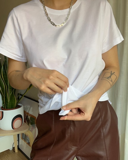 J'adore la forme triangulaire froncée que cette variante fait apparaître sur le ventre. Elle est particulièrement bien mise en valeur combinée à un pantalon taille haute. Pour ce faire, repliez l'ourlet de votre T-shirt vers l'intérieur à la longueur souhaitée, serrez-le autour de la taille et attache le tissu restant devant au milieu avec un élastique.