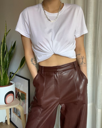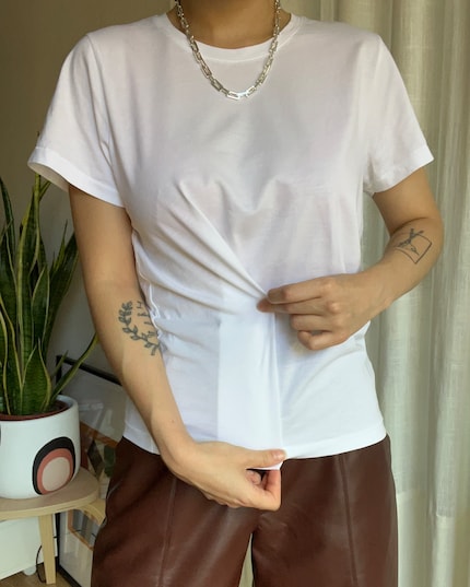 Nouer un T-shirt ample sur le devant est l'une des premières méthodes de stylisme que j'ai apprises. Mais aujourd'hui, je n'utiliserais plus cette astuce. D'une part parce qu’à mes yeux, cela n'a généralement pas beaucoup de style, mais surtout parce que le tissu se détend. Au lieu de cela, je fais appel à des élastiques à cheveux. Des derniers font tout au plus des plis dans le tissu et permettent de réaliser de nombreux looks.