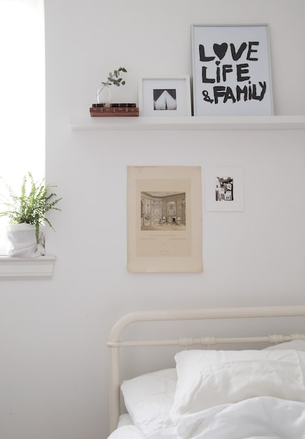Si vous voulez être mobile dans le choix de vos œuvres d'art, un accrochage avec une étagère murale est pratique. C'est la seule chose que vous devez monter. Ensuite, vous avez de la marge pour la déplacer. L'étagère doit offrir une surface suffisante et être conçue de manière à ce que les cadres photo ou une planchette à pince ne puissent pas tomber. Il existe pour cela des modèles qui ont une surélévation sur les côtés.